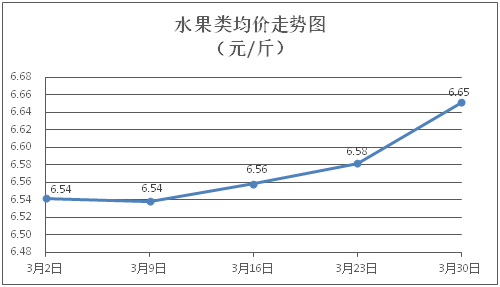 水果類商品價格小幅上漲。所監(jiān)測的6種水果商品價格波動情況為5漲1平,綜合零售均價為每斤6.65元,環(huán)比上漲1.06%。其中橙子、蘋果、葡萄零售均價分別為每斤6.17元、7.55元、13.93元,環(huán)比分別上漲0.49%、上漲0.27%、上漲1.09%。
