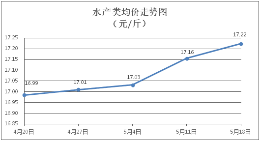 水產(chǎn)類商品價格小幅上漲。所監(jiān)測的9種水產(chǎn)商品價格波動情況為5漲1跌3平,綜合均價為每斤17.22元,環(huán)比上漲0.40%。其中:草魚、鯽魚、羅非魚、基圍蝦零售均價分別為每斤11.18元、14.27元、9.14元、30.50元,環(huán)比分別持平、上漲0.21%、上漲0.44%、上漲0.23%。