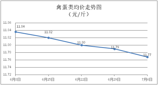 禽蛋類商品價格繼續(xù)微降。所監(jiān)測的5種禽蛋類商品價格波動情況為1漲3跌1平,綜合零售均價為每斤11.77元,環(huán)比下降0.19%。其中:白條雞、白條鴨零售均價分別為每斤20.55元、15.42元,環(huán)比分別下降0.39%、上漲0.06%;雞蛋、鴨蛋零售均價分別為每斤6.58元、7.11元,環(huán)比分別下降0.30%、下降0.28%。
