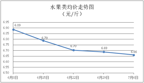 水果類商品價格持續(xù)走弱。所監(jiān)測的6種水果商品價格波動情況為1漲4跌1平,綜合零售均價為每斤6.66元,環(huán)比下降0.40%。其中橙子、蘋果、葡萄零售均價分別為每斤6.42元、7.64元、13.83元,環(huán)比分別下降0.31%、上漲0.13%、下降0.65%。