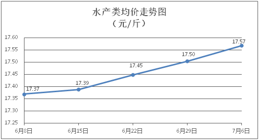 水產(chǎn)類商品價格漲勢延續(xù)。所監(jiān)測的9種水產(chǎn)商品價格波動情況為4漲2跌3平,綜合均價為每斤17.57元,環(huán)比上漲0.36%。其中:草魚、鯽魚、淡水鱸魚、基圍蝦零售均價分別為每斤11.20元、14.29元、22.64元、30.70元,環(huán)比分別下降0.09%、上漲0.78%、上漲0.40%、上漲0.29%。