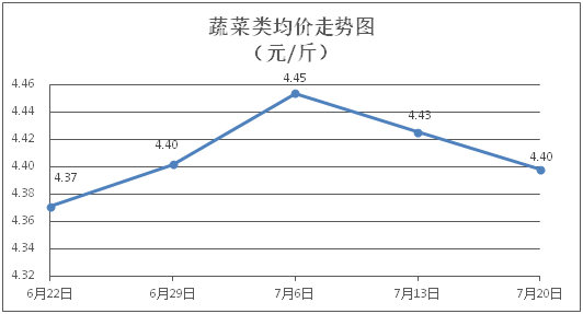 蔬菜類商品價格總體略降。所監(jiān)測的32 種蔬菜商品價格波動情況為10漲19跌3平,綜合零售均價為每斤4.40元,環(huán)比下降0.61%。其中:漲幅居前的品種包括青尖椒、西洋菜、蒜苔,零售均價分別為每斤4.43元、4.11元、7.67元,環(huán)比分別上漲2.31%、1.48%、1.19%;跌幅靠前的品種包括蓮藕、白莧菜、生菜,零售均價分別為每斤5.39元、3.97元、3.89元,環(huán)比分別下降3.92%、2.70%、2.51%。