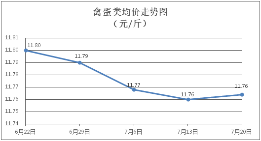 禽蛋類商品價格弱勢盤整。所監(jiān)測的5種禽蛋類商品價格波動情況為1漲3跌1平,綜合零售均價為每斤11.76元,環(huán)比上漲0.03%。其中:白條雞、白條鴨零售均價分別為每斤20.66元、15.39元,環(huán)比分別上漲0.39%、下降0.19%;雞蛋、鴨蛋零售均價分別為每斤6.52元、7.11元,環(huán)比分別下降0.15%、持平。