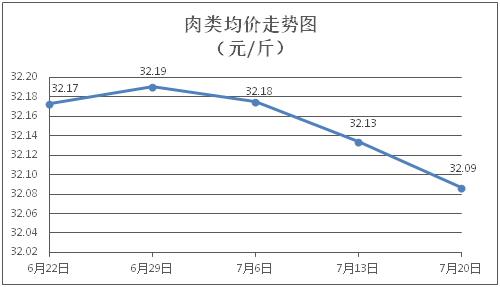 肉類商品價格走勢偏弱。所監(jiān)測的8種肉類商品價格波動情況為2漲5跌1平,綜合零售均價為每斤32.09元,環(huán)比下降0.15%。其中:排骨、精瘦肉、牛肉、帶骨羊肉零售均價分別為每斤30.25元、18.88元、46.51元、42.08元,環(huán)比分別上漲0.20%、下降0.11%、下降0.30%、下降0.26%。