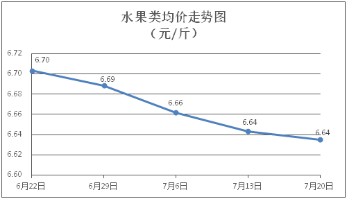 水果類商品價格升降互現(xiàn)。所監(jiān)測的6種水果商品價格波動情況為3漲3跌,綜合零售均價為每斤6.64元,環(huán)比下降0.13%。其中橙子、香蕉、梨零售均價分別為每斤6.45元、3.38元、5.29元,環(huán)比分別上漲0.47%、下降0.29%、下降1.31%。