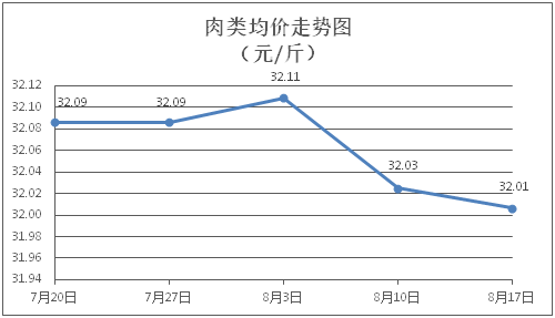 肉類商品價格微幅波動。所監(jiān)測的8種肉類商品價格波動情況為3漲5跌,綜合零售均價為每斤32.01元,環(huán)比下降0.06%。其中:排骨、精瘦肉、牛肉、帶骨羊肉零售均價分別為每斤30.43元、18.90元、46.22元、42.22元,環(huán)比分別上漲0.13%、下降0.11%、下降0.13%、上漲0.17%。