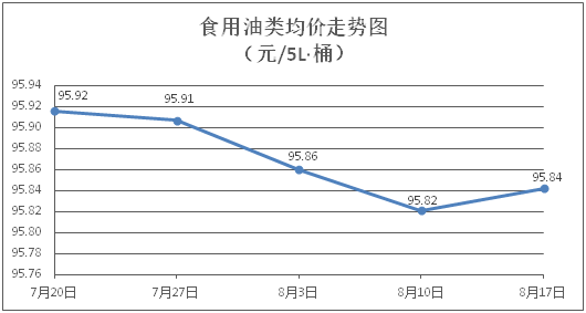 食用油類商品價格基本平穩(wěn)。所監(jiān)測的9種食用油(5L裝)商品價格波動情況為1漲8平,綜合零售均價為每桶95.84元,環(huán)比上漲0.02%。其中:金龍魚花生油、大豆油零售均價分別為每桶102.62元、61.61元,環(huán)比分別持平、上漲0.31%。
