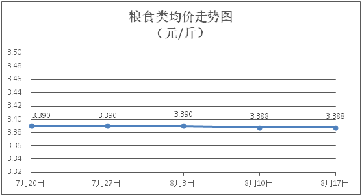 糧食類商品價格保持穩(wěn)定。所監(jiān)測的4種糧食類商品價格均持平,綜合零售均價為每斤3.388元。其中:絲苗米、面粉零售均價分別為每斤3.51元、3.39元,環(huán)比均持平。