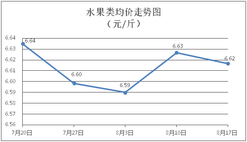 水果類商品價格窄幅盤整。所監(jiān)測的6種水果商品價格波動情況為1漲2跌3平,綜合零售均價為每斤6.62元,環(huán)比下降0.15%。其中橙子、香蕉、西瓜零售均價分別為每斤6.86元、3.25元、3.04元,環(huán)比分別持平、下降1.22%、上漲1.00%。