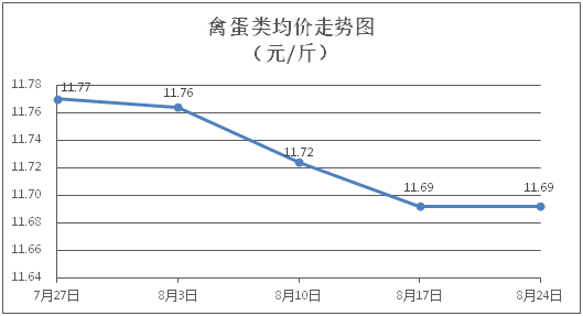 禽蛋類商品價格窄幅波動。所監(jiān)測的5種禽蛋類商品價格波動情況為3漲2跌,綜合零售均價為每斤11.69元,環(huán)比持平。其中:白條雞、白條鴨零售均價分別為每斤20.79元、15.22元,環(huán)比分別上漲0.48%、上漲0.07%;雞蛋、鴨蛋零售均價分別為每斤6.31元、7.10元,環(huán)比分別下降0.94%、上漲0.28%。