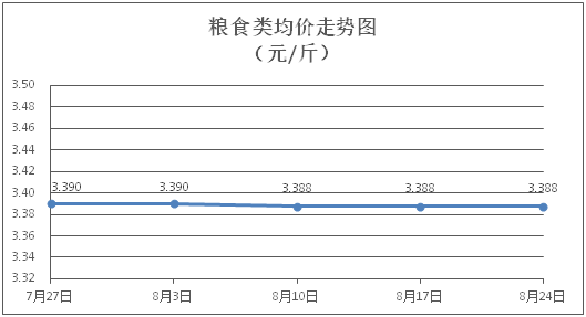 糧食類商品價格保持穩(wěn)定。所監(jiān)測的4種糧食類商品價格均持平,綜合零售均價為每斤3.388元。其中:絲苗米、面粉零售均價分別為每斤3.51元、3.39元,環(huán)比均持平。
