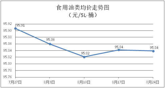 食用油類商品價格基本平穩(wěn)。所監(jiān)測的9種食用油(5L裝)商品價格波動情況為1跌8平,綜合零售均價為每桶95.84元,環(huán)比下降0.003%。其中:金龍魚花生油、大豆油零售均價分別為每桶102.62元、61.58元,環(huán)比分別持平、下降0.05%。