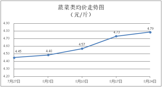蔬菜類商品價格總體略漲。所監(jiān)測的32 種蔬菜商品價格波動情況為20漲7跌5平,綜合零售均價為每斤4.79元,環(huán)比上漲1.15%。其中:漲幅居前的品種包括花菜、菠菜、絲瓜,零售均價分別為每斤5.51元、7.27元、5.55元,環(huán)比分別上漲6.78%、5.67%、4.32%;跌幅靠前的品種包括苦瓜、蒜頭、芥蘭,零售均價分別為每斤5.13元、8.03元、5.70元,環(huán)比分別下降3.21%、1.47%、1.38%。