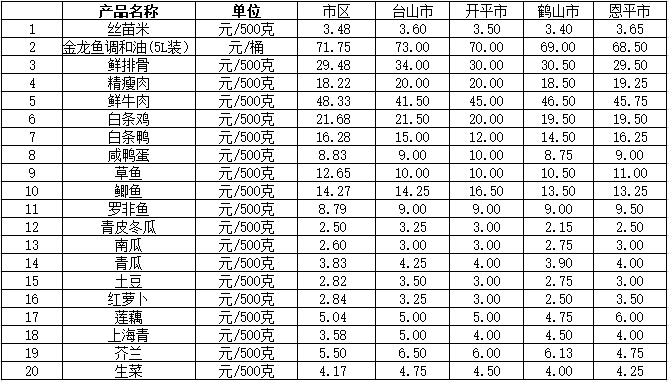 說明:1、表中價格為該地區(qū)監(jiān)測點上周綜合平均價;2、“市區(qū)”含蓬江區(qū)、江海區(qū)、新會區(qū),價格分別采自蓬江市場、江南市場、城東市場等13家農(nóng)貿(mào)市場;3、其他四個縣市價格分別采自新華市場、錦江市場等8家農(nóng)貿(mào)市場。
