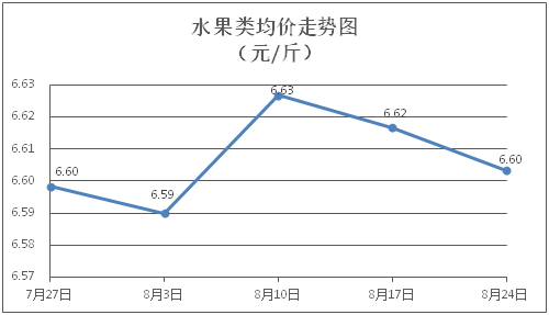 水果類商品價格漲少跌多。所監(jiān)測的6種水果商品價格波動情況為2漲3跌1平,綜合零售均價為每斤6.60元,環(huán)比下降0.20%。其中橙子、香蕉、葡萄零售均價分別為每斤7.01元、3.20元、13.34元,環(huán)比分別上漲2.19%、下降1.54%、下降1.48%。