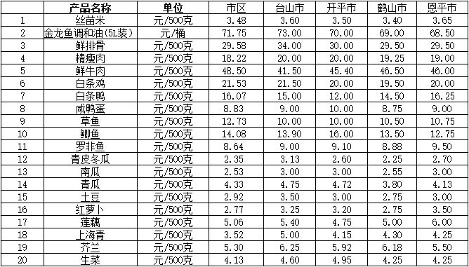 說(shuō)明:1、表中價(jià)格為該地區(qū)監(jiān)測(cè)點(diǎn)上周綜合平均價(jià);2、“市區(qū)”含蓬江區(qū)、江海區(qū)、新會(huì)區(qū),價(jià)格分別采自蓬江市場(chǎng)、江南市場(chǎng)、城東市場(chǎng)等13家農(nóng)貿(mào)市場(chǎng);3、其他四個(gè)縣市價(jià)格分別采自新華市場(chǎng)、錦江市場(chǎng)等8家農(nóng)貿(mào)市場(chǎng)。