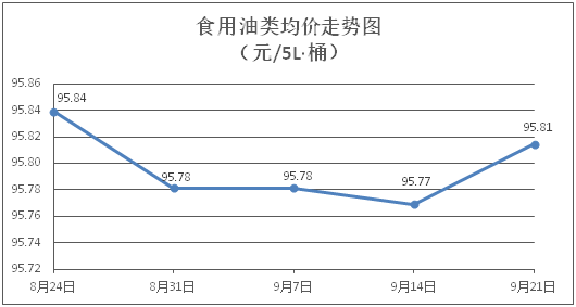 食用油類商品價(jià)格微幅上漲。所監(jiān)測(cè)的9種食用油(5L裝)商品價(jià)格波動(dòng)情況為6漲1跌2平,綜合零售均價(jià)為每桶95.81元,環(huán)比上漲0.05%。其中:魯花花生油、菜籽油零售均價(jià)分別為每桶156.49元、73.53元,環(huán)比分別上漲0.04%、上漲0.01%。