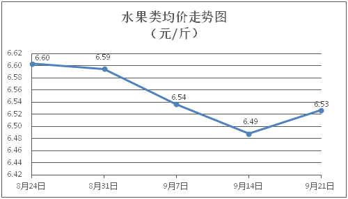 水果類商品價(jià)格有所回升。所監(jiān)測(cè)的6種水果商品價(jià)格波動(dòng)情況為4漲2跌,綜合零售均價(jià)為每斤6.53元,環(huán)比上漲0.59%。其中橙子、香蕉、梨零售均價(jià)分別為每斤7.38元、3.01元、5.31元,環(huán)比分別上漲3.22%、下降1.31%、上漲1.53%。