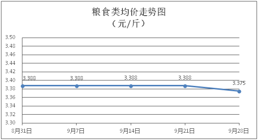 糧食類商品價格穩(wěn)中有降。所監(jiān)測的4種糧食類商品價格波動情況為2跌2平,綜合零售均價為每斤3.375元,環(huán)比下降0.37%。其中:絲苗米、面粉零售均價分別為每斤3.51元、3.35元,環(huán)比分別持平、下降1.18%。