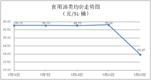 食用油類商品價格小幅下降。所監(jiān)測的9種食用油(5L裝)商品價格波動情況為3漲6跌,綜合零售均價為每桶93.97元,環(huán)比下降1.92%。其中:魯花花生油、菜籽油零售均價分別為每桶156.63元、72.09元,環(huán)比分別上漲0.09%、下降1.96%。
