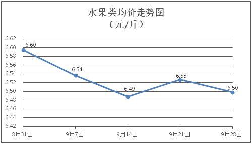 水果類商品價格升降互現(xiàn)。所監(jiān)測的6種水果商品價格波動情況為3漲3跌,綜合零售均價為每斤6.50元,環(huán)比下降0.43%。其中橙子、香蕉、梨零售均價分別為每斤7.53元、2.95元、5.32元,環(huán)比分別上漲2.03%、下降1.99%、上漲0.19%。