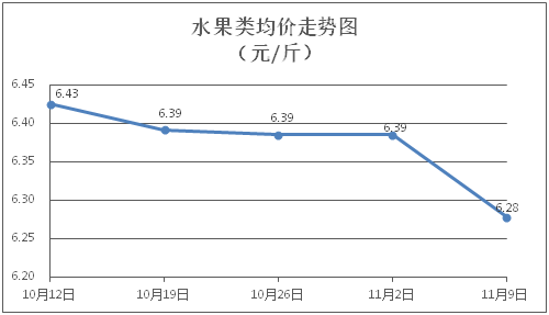 水果類商品價格小幅下降。所監(jiān)測的水果商品價格波動情況為2漲4跌,綜合零售均價為每斤6.28元,環(huán)比下降1.67%。其中橙子、蘋果、西瓜零售均價分別為每斤6.80元、7.96元、3.22元,環(huán)比分別下降7.36%、下降0.38%、上漲0.63%。