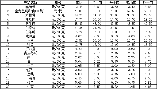 說明:1、表中價格為該地區(qū)監(jiān)測點上周綜合平均價;2、“市區(qū)”含蓬江區(qū)、江海區(qū)、新會區(qū),價格分別采自蓬江市場、江南市場、城東市場等13家農(nóng)貿(mào)市場;3、其他四個縣市價格分別采自新華市場、錦江市場等8家農(nóng)貿(mào)市場。