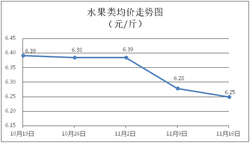 水果類商品價格略有下降。所監(jiān)測的水果商品價格波動情況為1漲3跌2平,綜合零售均價為每斤6.25元,環(huán)比下降0.45%。其中橙子、香蕉、梨零售均價分別為每斤6.73元、2.73元、5.28元,環(huán)比分別下降1.03%、上漲0.37%、下降0.38%。