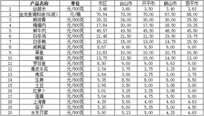 說明:1、表中價格為該地區(qū)監(jiān)測點上周綜合平均價;2、“市區(qū)”含蓬江區(qū)、江海區(qū)、新會區(qū),價格分別采自蓬江市場、江南市場、城東市場等13家農貿市場;3、其他四個縣市價格分別采自新華市場、錦江市場等8家農貿市場。