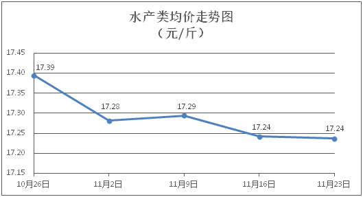 水產類商品價格微幅波動。所監(jiān)測的水產商品價格波動情況為2漲2跌5平,綜合均價為每斤17.24元,環(huán)比下降0.03%。其中:草魚、鯽魚、鳙魚、基圍蝦零售均價分別為每斤11.39元、13.75元、10.73元、28.33元,環(huán)比分別持平、下降0.58%、上漲0.47%、下降0.18%。
