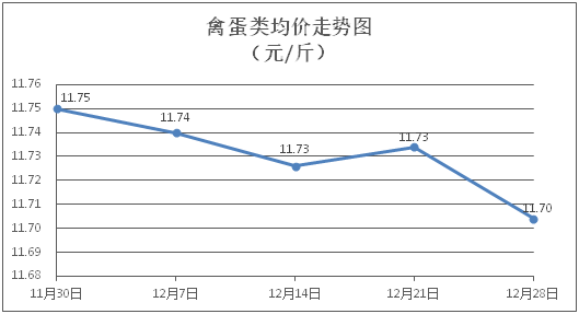 禽蛋類商品價格小幅波動。所監(jiān)測的禽蛋類商品價格波動情況為1漲1跌3平,綜合零售均價為每斤11.70元,環(huán)比下降0.26%。其中:白條雞、白條鴨零售均價分別為每斤20.76元、15.31元,環(huán)比分別下降0.81%、上漲0.13%;雞蛋、咸鴨蛋零售均價分別為每斤6.33元、8.93元,環(huán)比均持平。