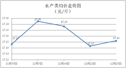 水產(chǎn)類商品價格窄幅盤整。所監(jiān)測的水產(chǎn)商品價格波動情況為4漲3跌2平,綜合均價為每斤17.18元,環(huán)比上漲0.10%。其中:草魚、鯽魚、鳙魚、基圍蝦零售均價分別為每斤11.43元、13.93元、10.65元、28.08元,環(huán)比分別下降0.26%、上漲0.51%、上漲0.38%、下降0.18%。