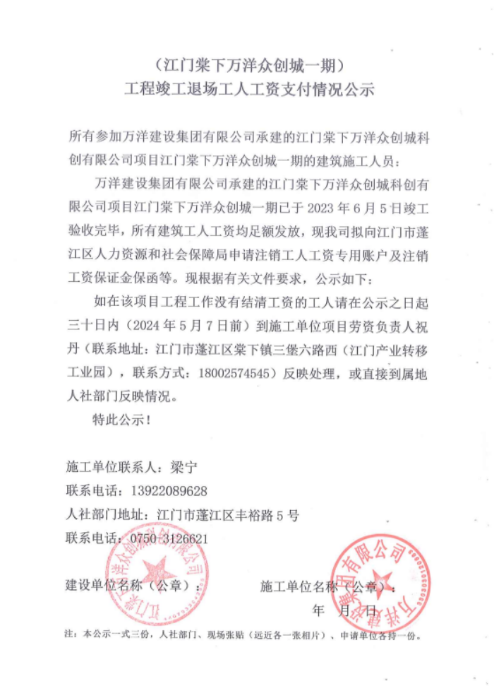 現(xiàn)將江門棠下萬(wàn)洋眾創(chuàng)城一期工程項(xiàng)目《工程竣工退場(chǎng)工人工資支付情況公示》掛網(wǎng)公示如下,如發(fā)現(xiàn)該項(xiàng)目存在欠薪等相關(guān)情況的,請(qǐng)?jiān)?0日內(nèi),請(qǐng)攜帶相關(guān)佐證材料,到施工單位項(xiàng)目或者人社部門反映情況。