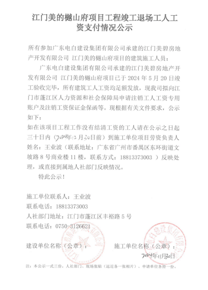現(xiàn)將樾山府1幢、2幢~7幢、8幢(文體中心)、9幢~13幢、一期地下室(絕對標高13.25、16.55、20.05地下室)、二期地下室(絕對24.25、27.55、31.15、34.45地下室)、電梯、門衛(wèi)室、商業(yè)1#、商業(yè)2#工程項目《工程竣工退場工人工資支付情況公示》掛網(wǎng)公示如下,如發(fā)現(xiàn)該項目存在欠薪等相關情況的,請在30日內(nèi),請攜帶相關佐證材料,到施工單位項目或者人社部門反映情況。