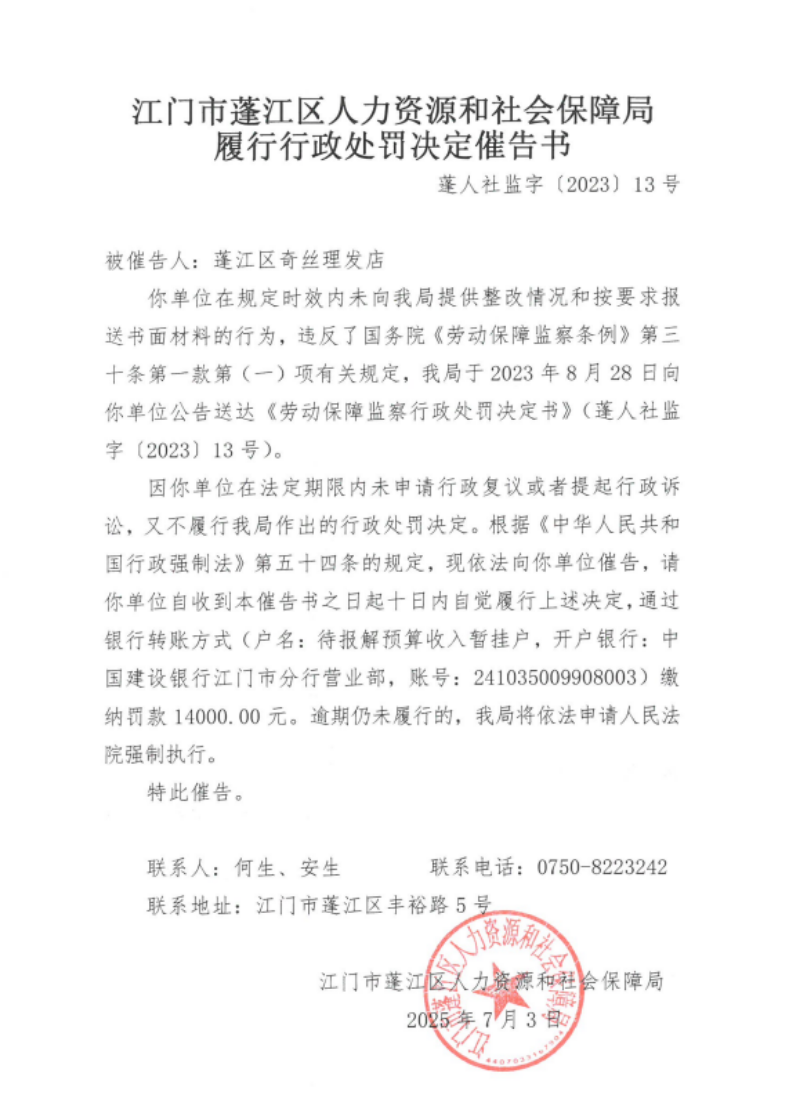 履行行政處罰決定催告書公告送達(dá)(蓬江區(qū)奇絲理發(fā)店)