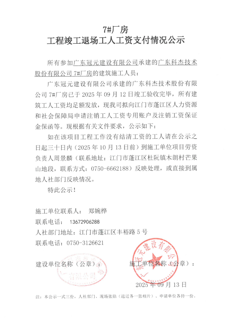 現(xiàn)將廣東科杰技術(shù)股份有限公司7#廠房工程項(xiàng)目《工程竣工退場(chǎng)工人工資支付情況公示》掛網(wǎng)公示如下,如發(fā)現(xiàn)該項(xiàng)目存在欠薪等相關(guān)情況的,請(qǐng)?jiān)?0日內(nèi),請(qǐng)攜帶相關(guān)佐證材料,到施工單位項(xiàng)目或者人社部門反映情況。