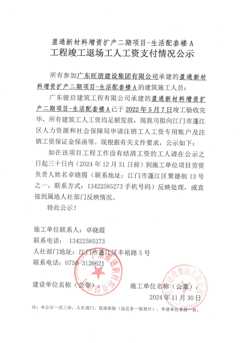 現(xiàn)將盈通新材料增資擴產(chǎn)二期項目—生活配套樓A工程《工程竣工退場工人工資支付情況公示》掛網(wǎng)公示如下,如發(fā)現(xiàn)該項目存在欠薪等相關(guān)情況的,請在30日內(nèi),請攜帶相關(guān)佐證材料,到施工單位項目或者人社部門反映情況。
