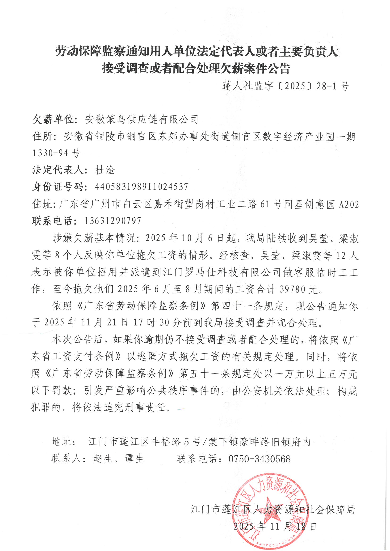 接受調(diào)查或者配合處理欠薪案件公告(安徽笨鳥(niǎo)供應(yīng)鏈有限公司)