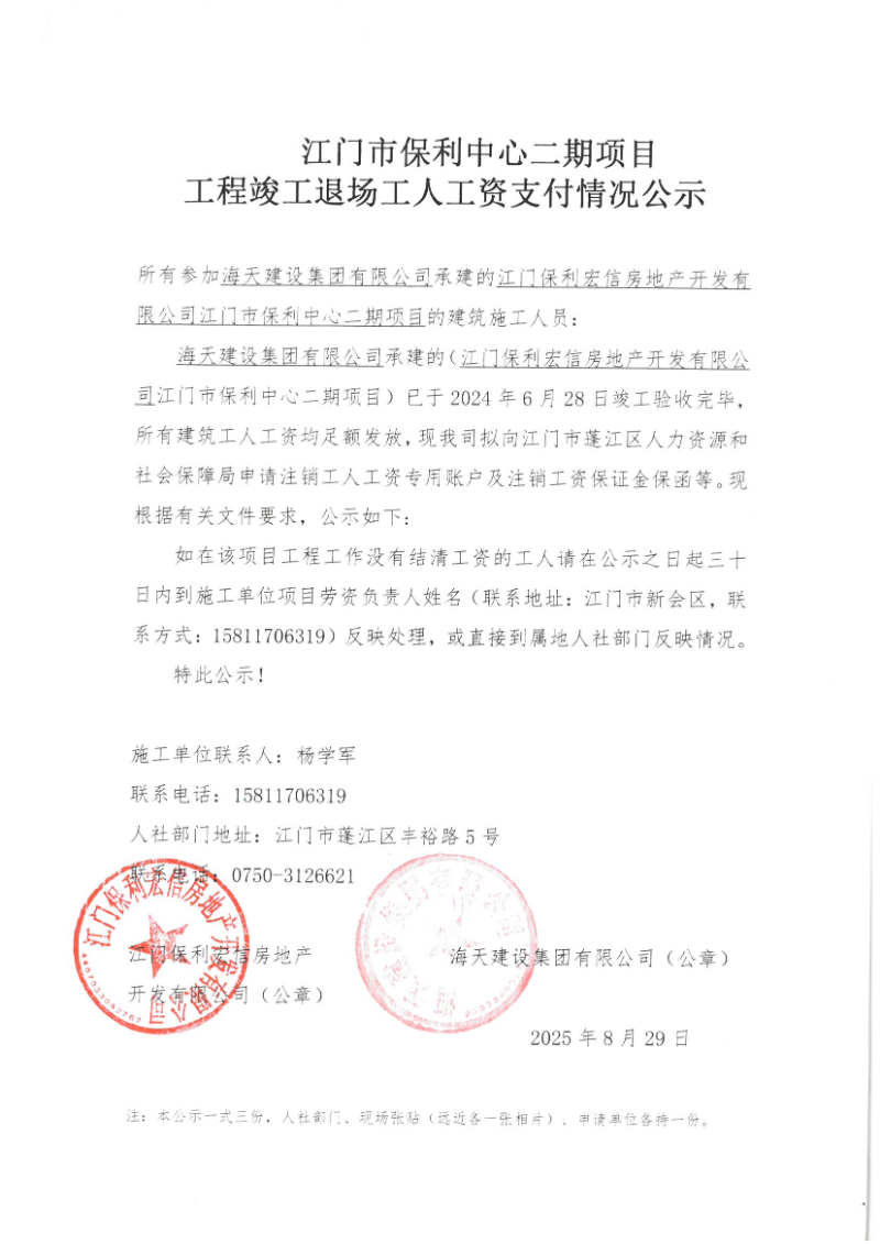 現(xiàn)將江門保利中心S1#-S17#、二期地下室工程項(xiàng)目《工程竣工退場(chǎng)工人工資支付情況公示》掛網(wǎng)公示如下,如發(fā)現(xiàn)該項(xiàng)目存在欠薪等相關(guān)情況的,請(qǐng)?jiān)?0日內(nèi),請(qǐng)攜帶相關(guān)佐證材料,到施工單位項(xiàng)目或者人社部門反映情況。