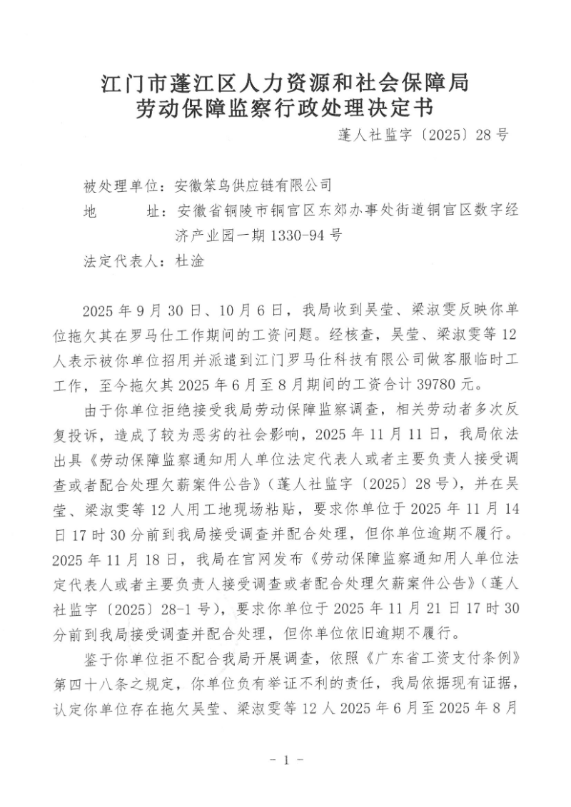 2025年9月30日、10月6日,我局收到吳瑩、梁淑雯反映你單位拖欠其在羅馬仕工作期間的工資問題。經(jīng)核查,吳瑩、梁淑雯等12人表示被你單位招用并派遣到江門羅馬仕科技有限公司做客服臨時工工作,至今拖欠其2025年6月至8月期間的工資合計39780元。