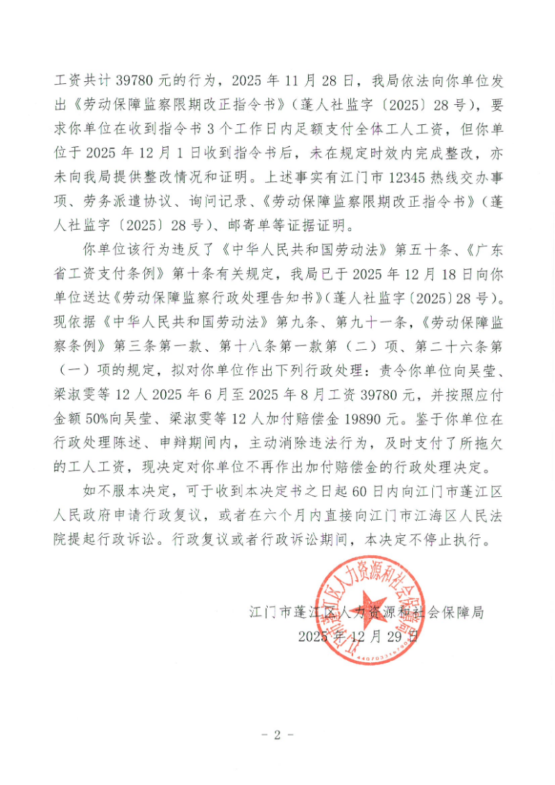 你單位該行為違反了《中華人民共和國勞動法》第五十條、《廣東省工資支付條例》第十條有關(guān)規(guī)定,我局已于2025年12月18日向你單位送達《勞動保障監(jiān)察行政處理告知書》(蓬人社監(jiān)字〔2025〕28號)?,F(xiàn)依據(jù)《中華人民共和國勞動法》第九條、第九十一條,《勞動保障監(jiān)察條例》第三條第一款、第十八條第一款第(二)項、第二十六條第(一)項的規(guī)定,擬對你單位作出下列行政處理:責(zé)令你單位向吳瑩、梁淑雯等12人2025年6月至2025年8月工資39780元,并按照應(yīng)付金額50%向吳瑩、梁淑雯等12人加付賠償金19890元。鑒于你單位在行政處理陳述、申辯期間內(nèi),主動消除違法行為,及時支付了所拖欠的工人工資,現(xiàn)決定對你單位不再作出加付賠償金的行政處理決定。