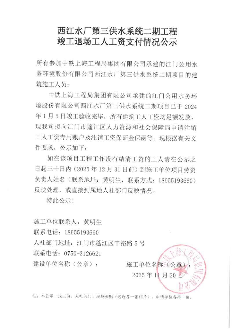 現(xiàn)將西江水廠第三供水系統(tǒng)二期工程項目《工程竣工退場工人工資支付情況公示》掛網(wǎng)公示如下,如發(fā)現(xiàn)該項目存在欠薪等相關(guān)情況的,請在30日內(nèi),請攜帶相關(guān)佐證材料,到施工單位項目或者人社部門反映情況。