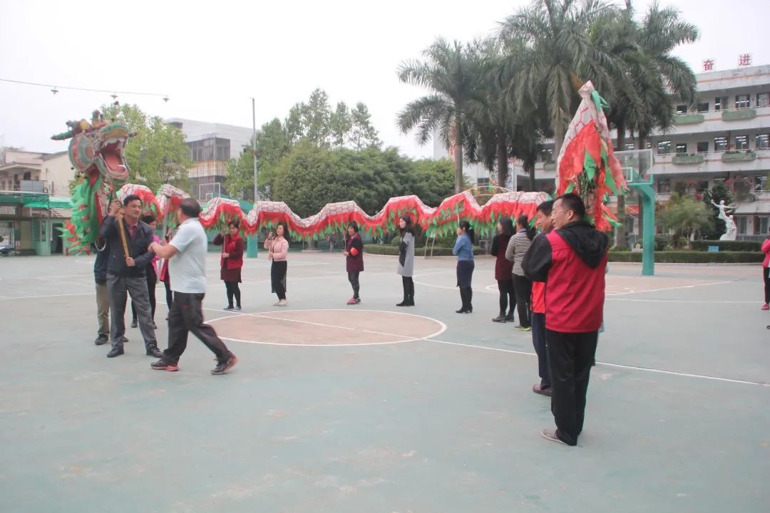 篁?yàn)持行男W(xué)全體教師學(xué)習(xí)舞龍技巧