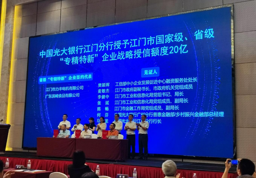 活動上,還舉行了授信簽約儀式,中國光大銀行江門分行為24家“小巨人”企業(yè)、427家省級專精特新企業(yè)戰(zhàn)略授信額度達(dá)20億元。