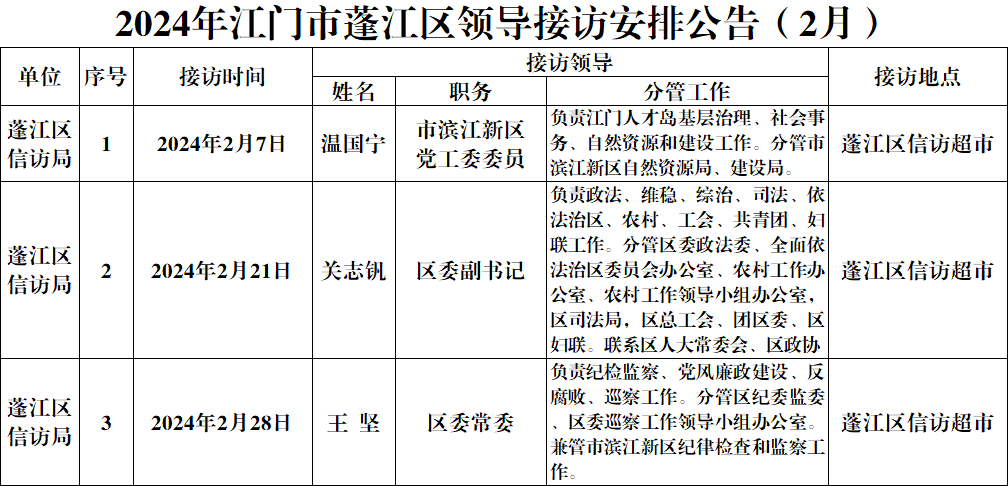 2024年江門市蓬江區(qū)領(lǐng)導(dǎo)接訪安排公告(2月)