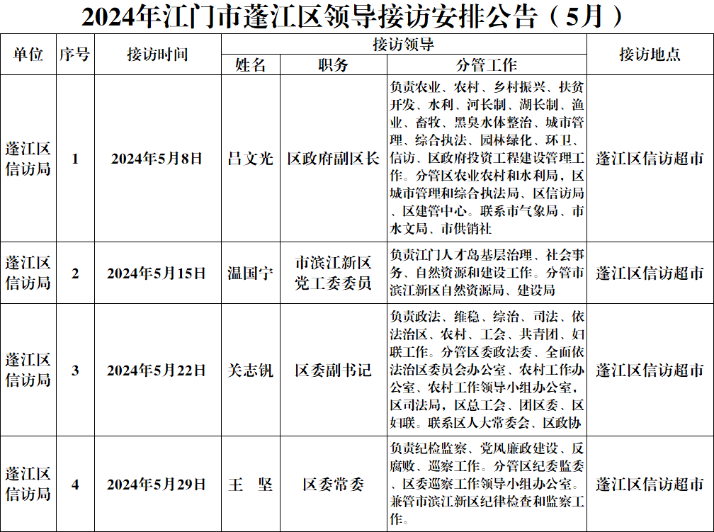 2024年江門市蓬江區(qū)領(lǐng)導(dǎo)接訪安排公告(5月)