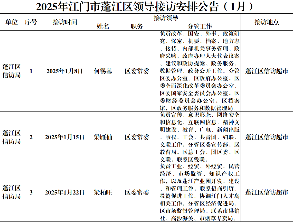 2025年江門市蓬江區(qū)領(lǐng)導(dǎo)接訪安排公告(1月)