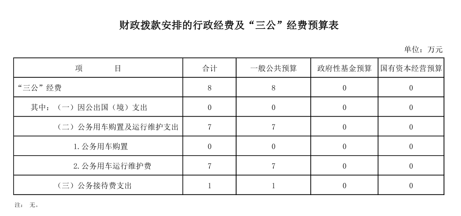 2023 年本部門(mén)財(cái)政撥款安排“三公”經(jīng)費(fèi)8 萬(wàn)元,比上年增加0 萬(wàn)元,增長(zhǎng)0 %,主要原因是與上年持平,無(wú)增減變化 。其中:因公出國(guó)(境)費(fèi)0 萬(wàn)元,比上年增加0 萬(wàn)元,增長(zhǎng)0 %,主要原因是與上年持平,無(wú)增減變化 ;公務(wù)用車購(gòu)置及運(yùn)行費(fèi)0 萬(wàn)元(公務(wù)用車購(gòu)置費(fèi)0 萬(wàn)元,比上年增加0 萬(wàn)元;公務(wù)用車運(yùn)行維護(hù)費(fèi)7 萬(wàn)元,比上年增加3 萬(wàn)元。)比上年增加3 萬(wàn)元,增長(zhǎng)75 %,主要原因是車齡長(zhǎng),使用頻密,車況較差,維修費(fèi)用增大 ;公務(wù)接待費(fèi)1 萬(wàn)元,比上年減少3 萬(wàn)元,下降75 %,主要原因是本部門(mén)厲行節(jié)約,節(jié)減運(yùn)行經(jīng)費(fèi) 。