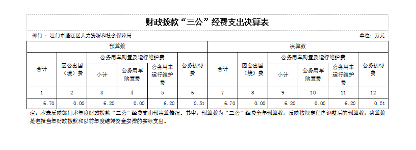 2022 年度“三公”經(jīng)費(fèi)財(cái)政撥款支出決算中,因公出國(境)費(fèi)0萬元,占0% ;公務(wù)用車購置及運(yùn)行維護(hù)費(fèi)支出6.2萬元,占92.4% ;公務(wù)接待費(fèi)支出0.51萬元,占7.6% 。具體情況如下: