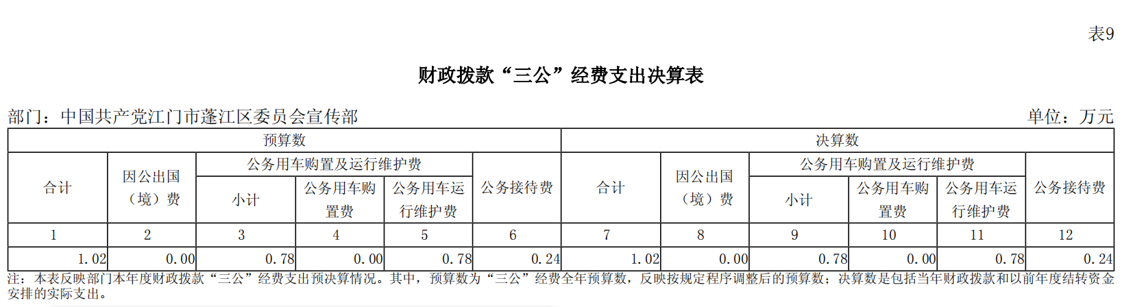 中國(guó)共產(chǎn)黨江門市蓬江區(qū)委員會(huì)宣傳部2024年度“三公”經(jīng)費(fèi)財(cái)政撥款支出決算為1.02萬(wàn)元,完成全年預(yù)算1.02萬(wàn)元的100%,比上年決算數(shù)減少0.12萬(wàn)元,下降10.3%。其中:因公出國(guó)(境)費(fèi)支出決算為0萬(wàn)元,完成預(yù)算0萬(wàn)元的--%(基數(shù)為0,不可比),比上年決算數(shù)增加0萬(wàn)元,增長(zhǎng)--(基數(shù)為0,不可比);公務(wù)用車購(gòu)置及運(yùn)行維護(hù)費(fèi)支出決算為0.78萬(wàn)元,完成預(yù)算0.78萬(wàn)元的100%,比上年決算數(shù)增加0.37萬(wàn)元,增長(zhǎng)89.2%;其中:公務(wù)用車購(gòu)置支出決算為0萬(wàn)元,完成預(yù)算0萬(wàn)元的--%(基數(shù)為0,不可比),比上年決算數(shù)增加0萬(wàn)元,增長(zhǎng)--(基數(shù)為0,不可比);公務(wù)用車運(yùn)行維護(hù)費(fèi)支出決算為0.78萬(wàn)元,完成預(yù)算0.78萬(wàn)元的100%,比上年決算數(shù)增加0.37萬(wàn)元,增長(zhǎng)89.2%;公務(wù)接待費(fèi)支出決算為0.24萬(wàn)元,完成預(yù)算0.24萬(wàn)元的100%,比上年決算數(shù)減少0.48萬(wàn)元,下降66.7%。